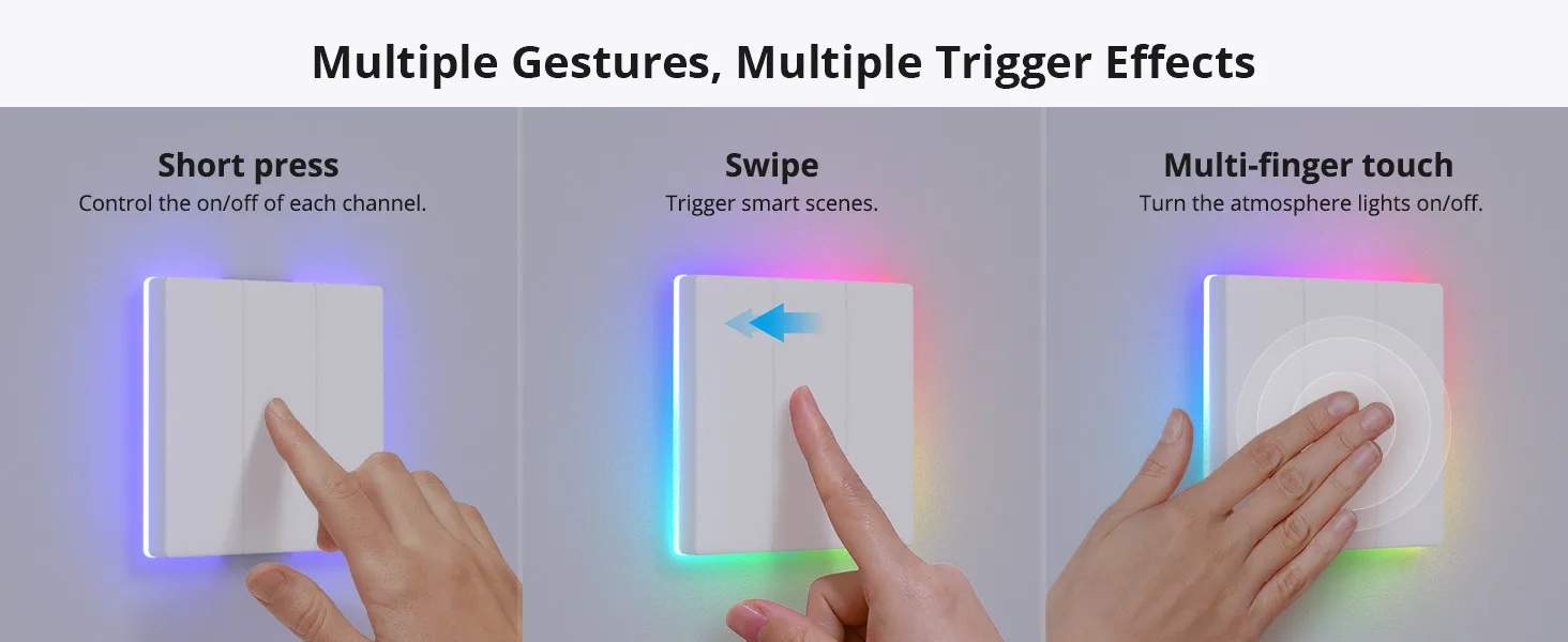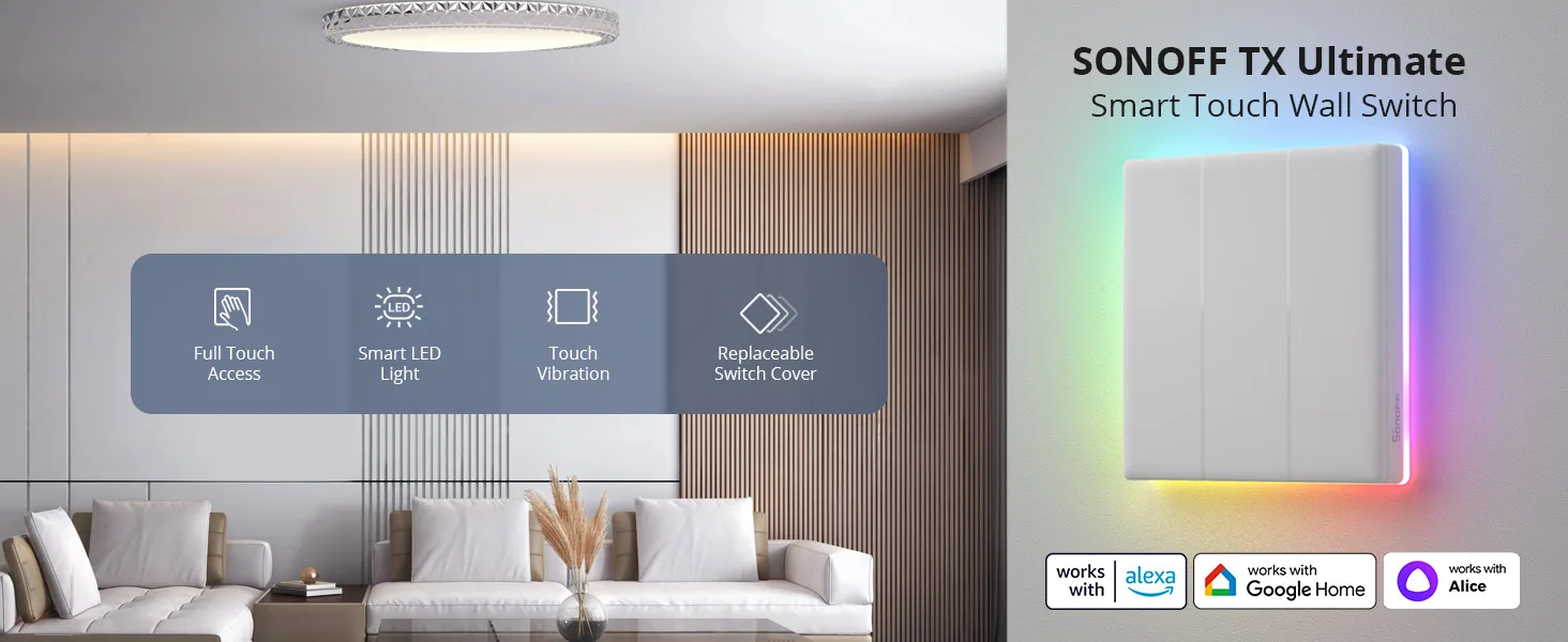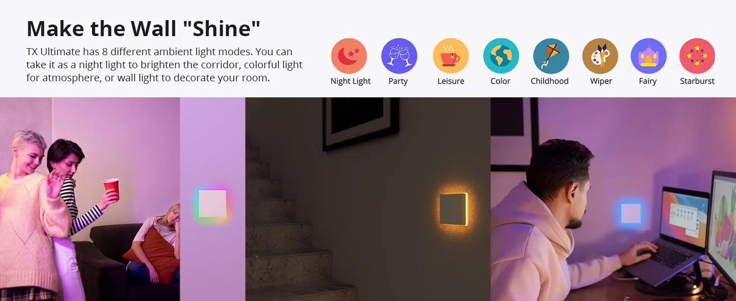 Lumină LED inteligentă: întrerupătorul de perete SONOFF T5 are pe spate o lumina ambinetala RGB. Pe lângă faptul că este folosita ca indicator de stare a intrerupatorului, poate fi folosita și ca lumină de noapte sau lumină ambientală pentru a vă lumina noaptea!