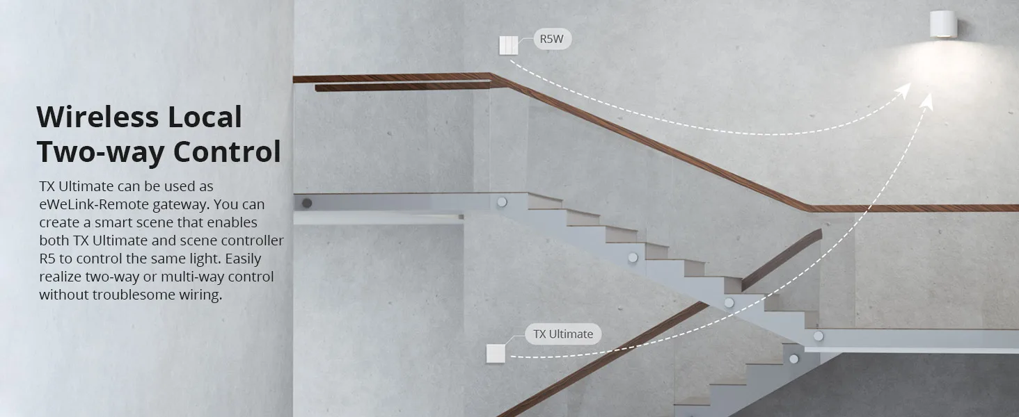 Comandă „eWeLink Remote”: întrerupătorul de perete SONOFF T5 are funcția gateway a „eWeLink Remote”. Dacă doriți să utilizați funcția de control „eWeLink Remote”, trebuie să o utilizați cu S-MATE sau cu telecomanda pentru scenă R5.